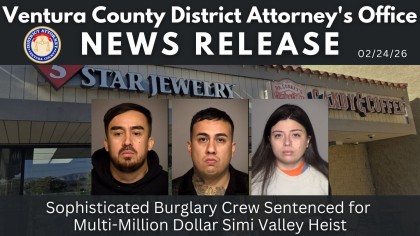 Ventura County District Attorney Erik Nasarenko announced today that three of the four members of a sophisticated burglary crew were sentenced on February 20, 2026. The crew is responsible for the coordinated commercial burglary on May 25, 2025, at 5-Star Jewelry & Watch Repair and Dr. Conkey’s Candy and Coffee Shop in Simi Valley. Manuel David Ibarra and Camilo Antonio Aguilar Lara were each sentenced to four years four months in the Ventura County Jail. Heidi Trujillo was sentenced to four years in jail. The fourth defendant, Sergio Andres Mejía-Machuca, had his sentencing hearing continued to March 26, 2026.