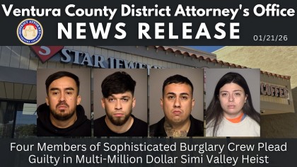 Ventura County District Attorney Erik Nasarenko announced today that four members of a sophisticated burglary crew have pled guilty to charges stemming from a coordinated commercial burglary that occurred on May 25, 2025, at 5-Star Jewelry and Dr. Conkey’s Candy and Coffee Shop in Simi Valley, resulting in losses exceeding $2 million. “This was not a crime of opportunity,” said District Attorney Erik Nasarenko. “These defendants planned carefully, conducted surveillance, and used specialized tools and techniques to carry out a highly sophisticated burglary that caused enormous financial harm. Their guilty pleas ensure accountability and reflect the strength of the evidence in this case.”